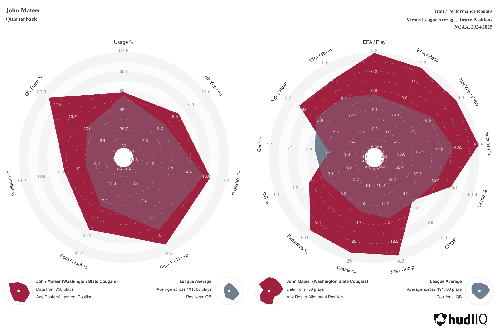 Using Hudl IQ Player Radar Data, we can see that Mateer was an exceptional quarterback in 2024, especially by Pac-12 standards.
