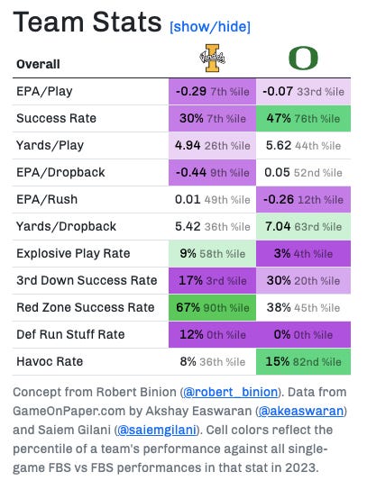 Perhaps the strangest aspect of Oregon-Idaho was the lack of explosiveness from the Oregon offense. We’ve come to know the Ducks as a team that gashes defenses in the air and on the ground, but through one game it did none of that. A 3% (fourth percentile) Explosive Play Rate is just not good at all. Does this mean the offensive line is not as good as we thought? Let’s keep an eye on this space.