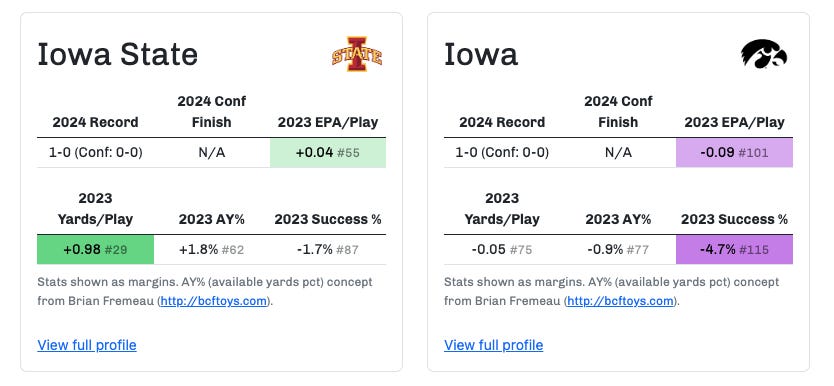 What do I care about with this matchup? I want to find out just how assy Iowa’s offense truly is. The Hawkeyes scored 40 (yes, 40!) points against Illinois State on Saturday, which certainly turned some heads. But the joke is on you because I will not allow a forty-point showing against an FCS team to truly change my mind. I need to see it to believe it. We only have a one-game sample size but things don’t look great if you ask me!