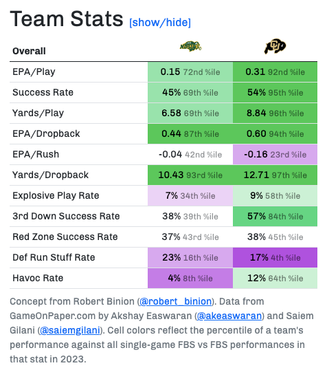 In Week 1, Colorado ranked in the 23rd percentile in EPA/Rush, which is a measure of how well a team performs relative to expectation. This means the Buffaloes severely underperformed on the majority of its rush plays. CU will likely need to do much better to establish a consistent run game against Nebraska.
